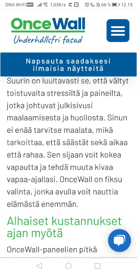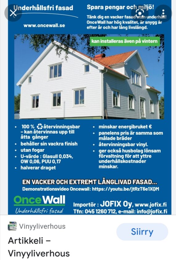 OnceWall Facebook https://m.facebook.com/100057664675415/ 🇫🇮🇨🇵🇸🇪🇳🇴🌍♻️🏆🥇🔍🔎✔️™️ Nyt maailman laadukkain Talon Ulkoverhous OnceWall ✔️™️ JOFIXfi ltä Suomessa (myös kaikkeen sisustamiseen) ESITTELY – Asiakas kokemus 🇨🇵 🇸🇪 🇳🇴 🇫🇮 www.oncewall.se https://m.facebook.com/watch/ TALOUS / ENERGIAN SÄÄSTÖÄ 🇫🇮 Suomessa JOFIX Oy / www.oncewall.se