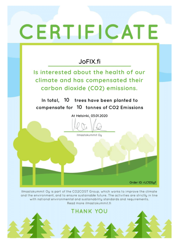 JOFIX Oy olkaa hyvä – ohessa on Ilmasto Sertifikaattinne. Sertifikaatti todistaa, että JOFIX Oy on huolehtinut ilmastostamme ja vähentänyt hiilidioksidipäästöjä puhtaamman, kestävän, tulevaisuuden puolesta. Olkaa ylpeitä ! Olette tehneet erittäin hienon ja tärkeän ympäristöteon ! Ystävällisin terveisin ! Ilmastokummit Oy