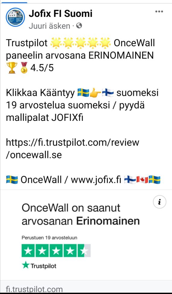 Trustpilot OnceWall paneelin arvosana ERINOMAINEN4.6/5 Klikkaa Kääntyy suomeksi 19 arvostelua suomeksi / pyydä mallipalat JOFIX Sähköposti info@jofix.fi KLIKKAA SUOMEKSI jo 20 OnceWall asiakas kokemusta https://fi.trustpilot.com/review/oncewall.se – saat ilmaiset mallipalat, laita pyyntö : info@jofix.fi, saat ne postitse. OnceWall / www.jofix.fi