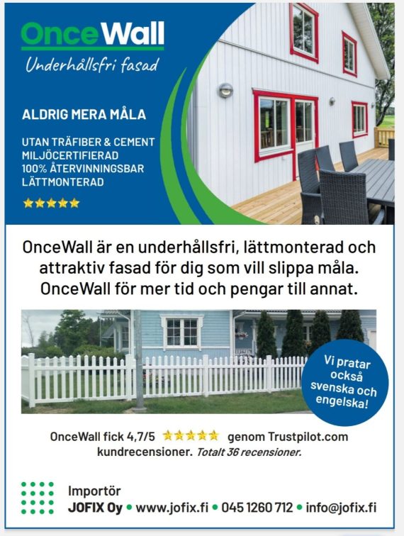 OnceWallin kehityksen juuret ovat 1960 luvulta Lavella n kehittämisestä nykyiseksi vahvaksi, kestäväksi, energiatehokkaaksi paneeleiksi moniin muihinkin käyttökohteisiin (mm märkätilat, sisustus) kuin kaikkien rakennusten huolto vapaaksi Ulkoverhouksesi. Suomen LIPPUA klikkaamalla noin 100 sivua perusteellista tietoa mm taloudesta, kierrätyksestä, sertifikaateista, testeistä, tutkimuksista videoineen liitteineen Suomeksi os www.oncewall.se KLIK Suomen lippu Kaikki lisätiedot, […]