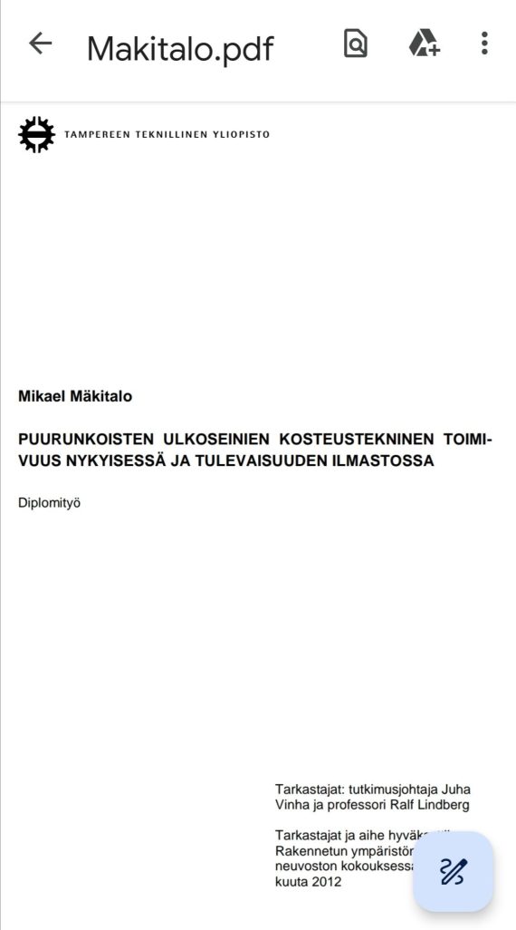 ”Rakennustekniikan koulutusohjelmaMÄKITALO, MIKAEL: Puurunkoisten ulkoseinien kosteustekninen toimivuusnykyisessä ja tulevaisuuden ilmastossa. ”