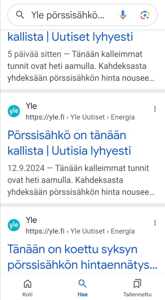 Pörssisähkö on tänäänkin yhä kallista, vaikkeivät hintapiikit ylläkään aivan eilisen tasolle. Tänään kalleimmat tunnit ovat heti aamulla. Kahdeksasta yhdeksään pörssisähkön hinta nousee liki 45 senttiin kilowattitunnilta. Koko vuorokauden kilowattitunnin keskihinta on lähes 25 senttiä.