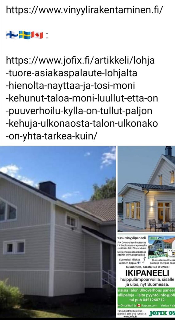 ? Mihin käyttäisit 7000 € ? ” Hyvältä näyttää ! ! ” Tämän 🇫🇮 suomalaisen JOFIX iki ♻️ eko Talon Ulkoverhous materiaalit alkn 3 kolmella tonnilla / n 3000 €. Tee itse säästät vähintään 7000 €. Vertaa itse tästä linkistä 🇫🇮🇸🇪🇨🇦 alla vain meillä voit valita A, B tai C […]