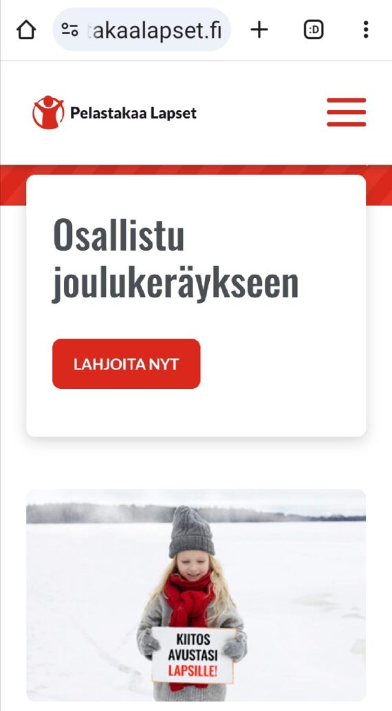 Kiitos, että autatte lapsia kanssamme. Tietoa työstämme: pelastakaalapset.fi Tietoa lahjoittajatietojen käsittelystä: pelastakaalapset.fi/asiakasrekisteri