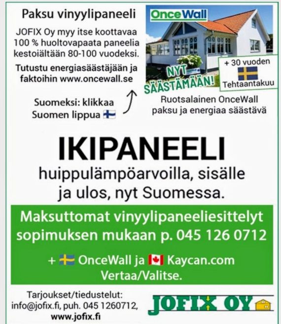 TÄSSÄ LINKKI : https://youtu.be/m9xcNt3XD4s Suomalainen Kanadassa, in Canada näyttää millaista tuo vinyylipaneeli on. Hän puhuu saitingista nimi Vinyyli verhoukselle = vinylsiding Canada. Lyhyt havainnollinen video miksi miljoonia taloja verhotaan Vinyylillä. KATSO Saitinkia seinään YouTubessahttps://youtu.be/m9xcNt3XD4s Tuoreimmat tarjoukset/uutiset :https://www.jofix.fi/uutiset/ RAKENTAVIN YHTEISTYÖTERVEISIN ! JOFIX Oywww.jofix.fiemail : info@jofix.fiPuh 0451260712. LISÄTIETOA :Ekoloogisuudesta www.jofix.suntuubi.com Tekniikan Maailma/JOFIX […]