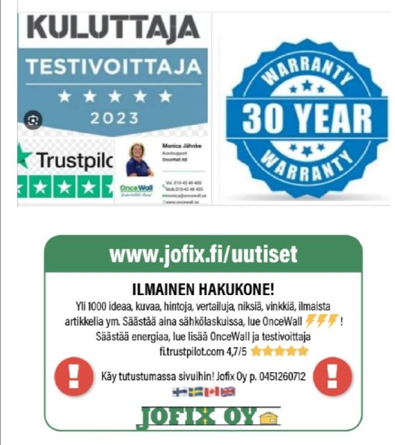 ABC ASIAKASKOKEMUKSIA : https://www.jofix.fi/?s=ASIAKASKOKEMUKSIA+ A) Esitteitä, videoita mm kokoamis ohjeita YouTube https://youtube.com/@oncewall?si=LtRb_nAfVxCAWLuN Suomeksi esitteet, kokoamisohje ym https://www.jofix.fi/artikkeli/materiaalitietoa/ B) Suomeksi Paina Vain Suomen 🇫🇮 LIPPUA https://oncewall.se/miljovanlig-fasad/ Ja https://www.jofix.fi/materiaalitietoa/ C) Suomeksi Paina Vain Suomen 🇫🇮 LIPPUA https://oncewall.se/ Ja https://www.facebook.com/share/1DEDBsX86n/ Tai https://www.jofix.fi/oncewall/ Kysy suora linkki : https://www.jofix.fi/ota-yhteytta/