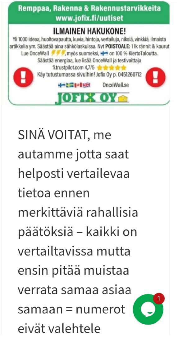 A) https://www.jofix.fi/artikkeli/kakkosnelonen-on-47-mm-vastaa-normina-oncewall-in-talon-ulkoverhous-paneelia-suositus-on-28-mm-mutta-rautakaupoista-loytyy-vain-20-23-mm-paksuja-paneeleita-nain-vastaa-lohjan-kaupunki-mika-on/ B) OnceWall säästää jopa 38.000 € + satoja euroja lämmityskustannuksia vuodessa koska paneeli paksuus vertaa tuu lähes 2 x 4 nelosen paksuuteen. Esitteet, itse kokoamis / kasaamisohjetta https://www.jofix.fi/oncewall/ C) OnceWall Asiakkaiden kokemuksia / arvosteluja 60 vuoden ajalta mm Trustpilot.com (167 Miljoonaa kävijää) 9,4/10, suomeksi fi.trustpulit.com : https://www.jofix.fi/?s=Trustpilot
