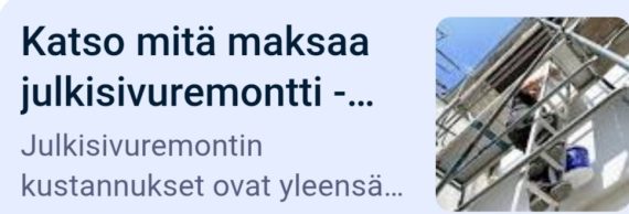 Google ja Artikkeli VAIN niille jotka haluavat säästää paljon rahaa (30.000 € ) Johonkin muuhun : https://www.jofix.fi/artikkeli/saat-valita-puu-tai-vinyyli-talviehdoilla/ AI-yhteenveto Talon ulkoverhouksen ”oikeat hinnat” vaihtelevat suuresti materiaalin, työn laajuuden ja kohteen mukaan, mutta keskimäärin ulkoverhouksen vaihto maksaa noin 200–500 euroa neliömetriltä, ja kokonaiskustannus voi olla 7 000–30 000 euroa tai enemmän pientaloissa. Maalaukseen tarvitaan […]