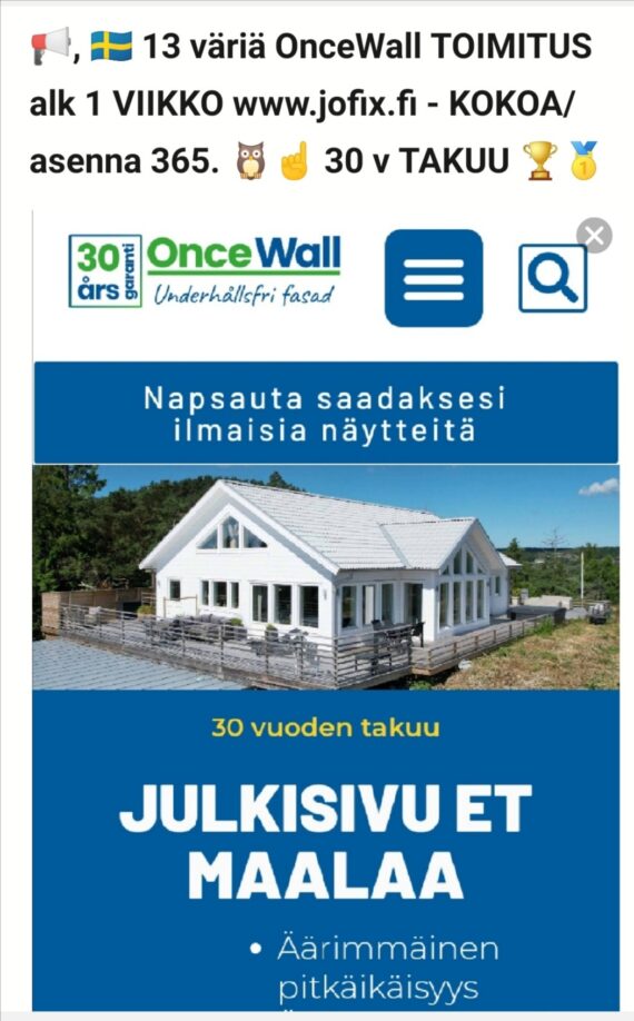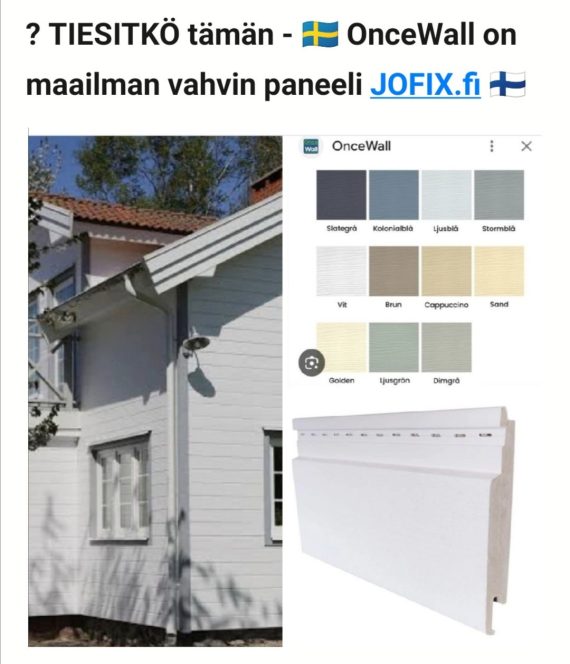 A) BASTA Suomeksi https://www.jofix.fi/artikkeli/basta-parasta-laatua-ja-kestavyytta-maailmassa-jarkeville-ihmisille-jotka-mielellaan-saastavat-30-000-e-kuin-haaskaavat-rahansa-ja-vapaa-aikansa-loppuelamansa-talon-ulkoverhous-remonttei/ B) OnceWall Hakukone https://www.jofix.fi/artikkeli/maailman-paras/ C) OnceWall kotisivut Suomeksi Paina Vain Suomen 🇫🇮. LIPPUA https://oncewall.se/ Tai kysy mitä vaan info@jofix.fi / puh 0451260712 Olli