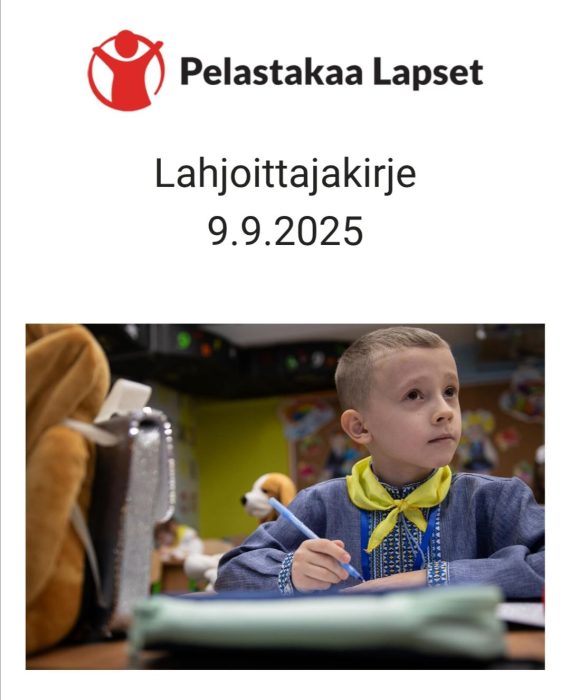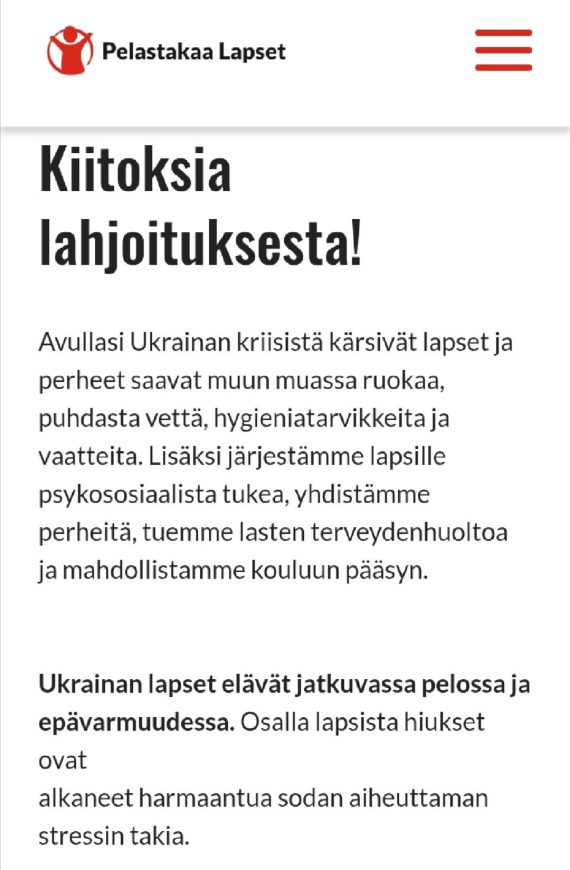 Linkki : https://www.pelastakaalapset.fi/?gad_source=1&gad_campaignid=22981864528&gclid=Cj0KCQjwoP_FBhDFARIsANPG24ME7C3wDlnOU5_qnj2cVnq4NboMj2wKOp0ejMHDQTXheUKRqRUmxeAaAodPEALw_wcB