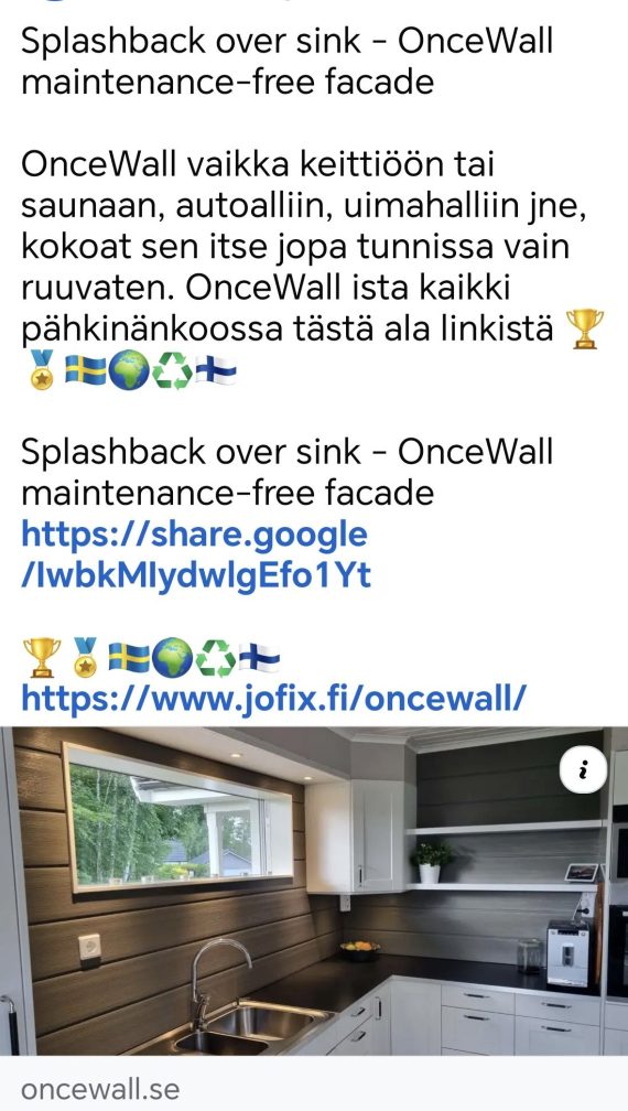 Splashback over sink – OnceWall maintenance-free facade OnceWall minne haluat – you name it – vaikka keittiöön tai saunaan, autoalliin, uimahalliin jne, kokoat sen itse jopa tunnissa vain ruuvaten. OnceWall ista kaikki pähkinänkoossa tästä ala linkistä 🏆🏅🇸🇪🌍♻️🇫🇮 Splashback over sink – OnceWall maintenance-free facade https://share.google/IwbkMIydwlgEfo1Yt https://share.google/IwbkMIydwlgEfo1Yt 🏆🏅🇸🇪🌍♻️🇫🇮 https://www.jofix.fi/oncewall/ OnceWall