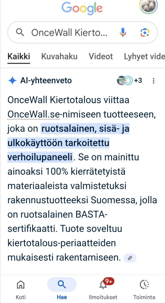 OnceWall Kiertotalous viittaa OnceWall.se-nimiseen tuotteeseen, joka on ruotsalainen, sisä- ja ulkokäyttöön tarkoitettu verhoilupaneeli. Se on mainittu ainoaksi 100% kierrätetyistä materiaaleista valmistetuksi rakennustuotteeksi Suomessa, jolla on ruotsalainen BASTA-sertifikaatti. Tuote soveltuu kiertotalous-periaatteiden mukaisesti rakentamiseen. Mitä OnceWall tarjoaa? Miten OnceWall liittyy kiertotalouteen?