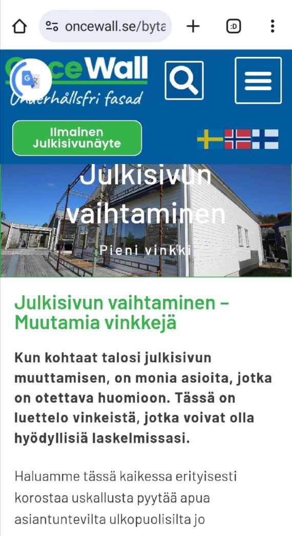 Näitkö tämän uutisen? Katso nyt tässä n 60 sek miten OnceWall uusi ekologisesti KOULUN Ruotsissa ja koulu säästää 100.000 €! https://youtube.com/watch?v=aWbmNftqL3M&si=rTPJxnG5fHOlLjsL Tiesitkö mitä ulko maali on? Tutkitusti Puu verhousta on pakko hoitaa, maalata 3 – 5 vuoden välein siksi maalaus kerroilla kertyy maalia n 3 cm kerros joka joka on […]