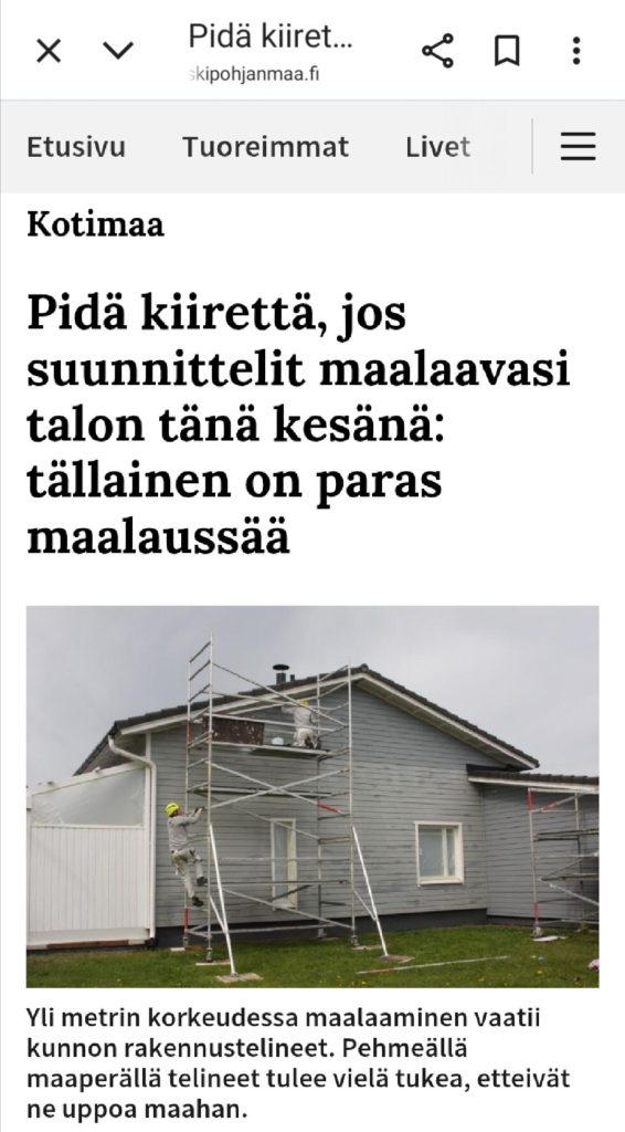 On se kumma kun mulla on menny pienemmän talon maalauksessa koko kesä eikä vieläkään oo valmis. Ja on se kumma että saat satasella nosturin viikonlopuksi kun tolla hinnalla sitä ei täältäpäin saa mistään edes päiväksi.