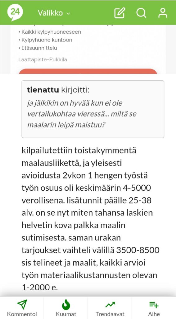 vaikeetahankalaa2009-08-18 13:44:03maalarin palkkoja kirjoitti:kilpailutettiin toistakymmentä maalausliikettä, ja yleisesti avioidusta 2vkon 1 hengen työstä työn osuus oli keskimäärin 4-5000 verollisena. lisätunnit päälle 25-38 alv. on se nyt miten tahansa laskien helvetin kova palkka maalin sutimisesta. saman urakan tarjoukset vaihteli välillä 3500-8500 sis telineet ja maalit, kaikki arvioi työn materiaalikustannusten olevan 1-2000 e.Lue lisääOokko koskaan tutustunu siihen että mitä kaikkia varoja, vakuutuksia yms pakollisia ja puolipakollisia maksetaan noista 4-5t€ hinnoista? Ja jos luulet että siitä jää miljoona kuussa käteen, niin vilkaise millä autolla se maalari siihen pihalle tuli – ei ne rahassa kieri sit kuitenkaan?