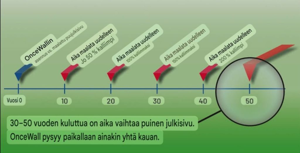 Tässä näet miten maksettavaa kertyy vuosittain ja huoltoa sekä jatkuvaa maalausta erityisesti etelän puoleinen seinä :