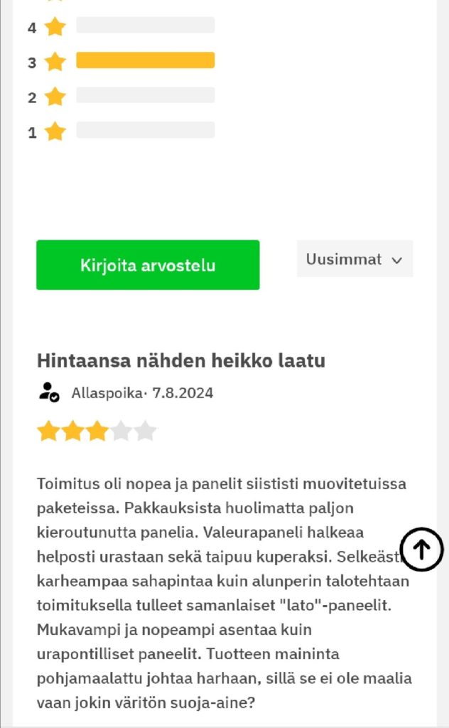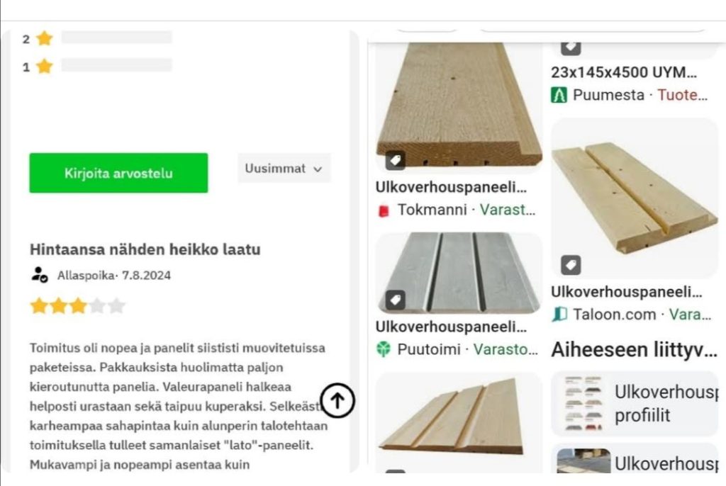 ”… Pakkauksista huolimatta paljon kieroutunutta panelia. Valeurapaneli halkeaa helposti urastaan sekä taipuu kuperaksi. Selkeästi karheampaa sahapintaa kuin alunperin talotehtaan toimituksella tulleet samanlaiset ”lato”-paneelit. ”