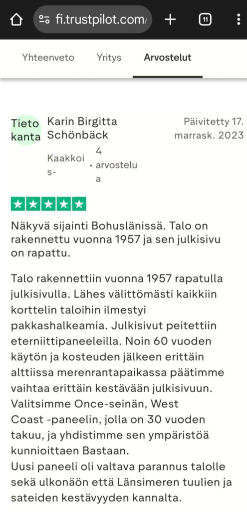 OnceWallin West Coast -paneelilla saat täysin huoltovapaan julkisivun, joka on suunniteltu kestämään pohjoismaista ilmastoa ja samalla antamaan kodillesi ajattoman ja elegantin ilmeen. 🌲🏠