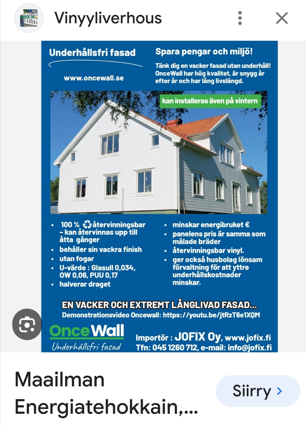 Tarkoittaa sitä, metsiä, puita Ei ainakaan Talon Ulko VERHOUKSIIN tarvitse kaataa, siten HIILINIELUT pysyvät vahvempina ! Lue niin tiedät OnceWall ista kaiken :