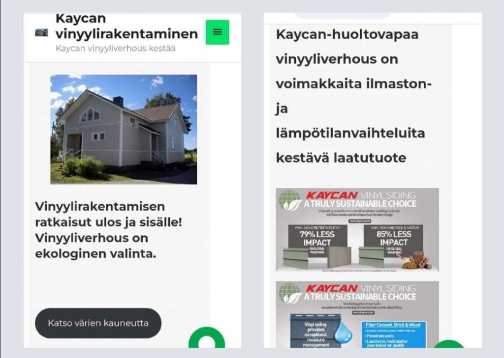 KANADA Kaycan-huoltovapaa vinyyliverhous on voimakkaita ilmaston- ja lämpötilanvaihteluita kestävä LAATUTUOTE. Tässä sertifikaatit ja vertailulaskelmat.