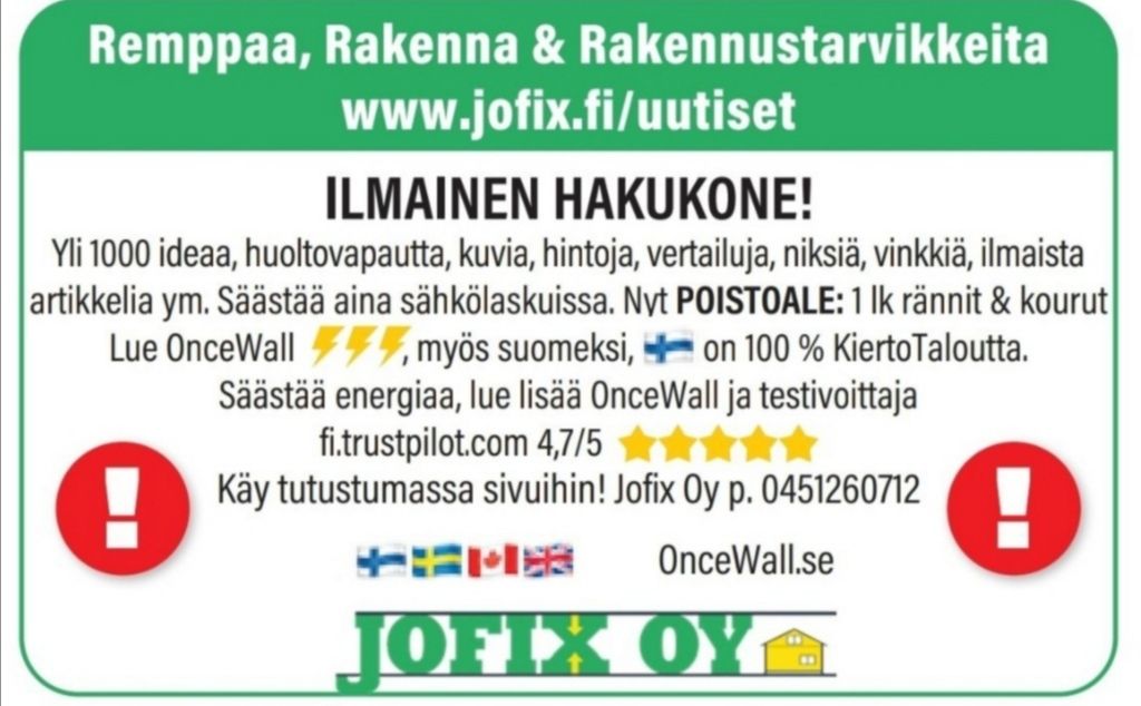 PÄÄTYKOLMIOT KERRALLA 1 PÄIVÄSSÄ KUNTOON Tarjous alk 190 euroa : LUE LISÄÄ EKO RAKENTAMISESTA : www.vinyylirakentaminen.fi 🇫🇮🇨🇦 PYYDÄ ILMAISET VÄRI MALLIPALAT Puh […]