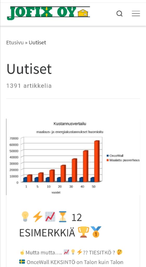 Tulos = SÀÀstöÀ ulkoverhouksesta  0.17 / 0,06 OnceWall samalla seinĂ€llĂ€ = on siis 3 x parempi
