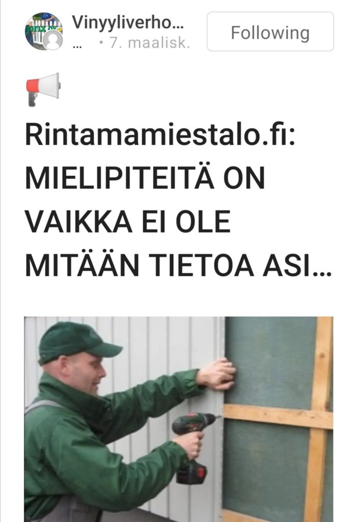 ”On se sitten hienoa miten kaikilla on mielipide – vaikka kokemuksia ei juuri kellään :D” Kirjoittaja :” Labyrint64 päivämäärä Ke Tammi 24, 2018 15:12 ”Rintamamiestalofi • katso viestiketjua – Vinyyliverhous, puolesta vai vastaan?