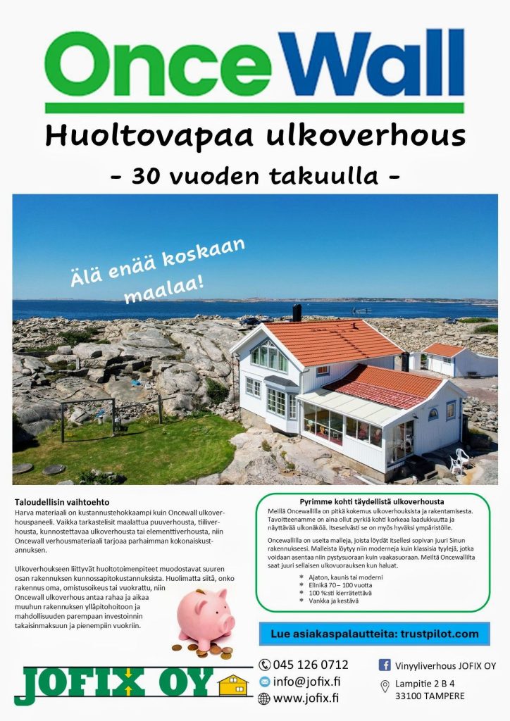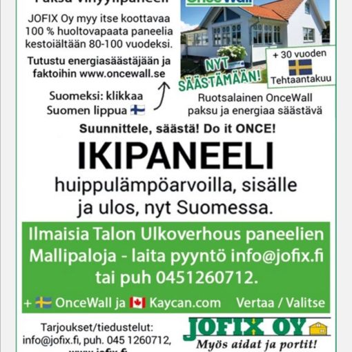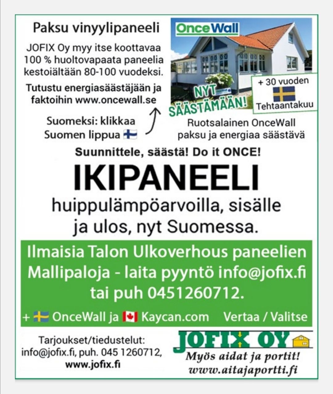 NYT NÄET LIVENÄ tai tilaa vain mallipalat info@jofix.fi. Markkinat Lempäälässä 13.4 TERVETULOA tutustumaan ! Nr 1 🏆🏅 TAPAHTUMATYTÖT 13.4 Lempäälä Manttaalitalo sunnuntaina klo 11-15 LINKKI : Esittelyssä TESTIVOITTAJA Trustpilot.com OnceWall  Ruotsalainen iki + eko ♻️ 3 X ⚡⚡⚡Energia säästö BASTA Sertifioitu paksu KEVYT HELPPO Itse Koottava vinyyli paneeli valmiilla ruuveilla (riittää vain ruuvikone ja käsisaha) OnceWall.se + paina vain Suomen LIPPUA ja alat säästää omia rahojasi 30.000 – 38.000 € JOHONKIN MUUHUN. Halvemmalla kuin Puu + Bonuksena Ruotsalaisen  Tehtaan Uddevalla 30 vuoden Takuu :
