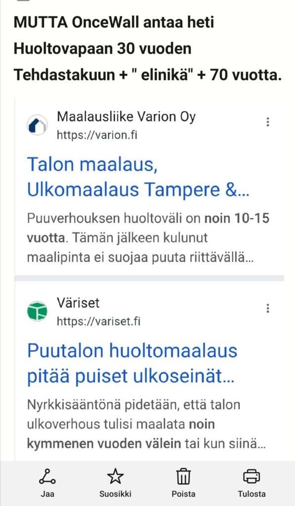 ⚠️YLE, ENTISAIKOJEN TALOT on… ” Ilmastonmuutos lisää mm rankka sateita niin talvella kuin kesällä…myrskytuulia, hellettä, pakkasia ( 3 x parempi U-arvo vain 0,06 Wikipedia / puu + 0,17, Tiili + 0,20). OnceWall on juuri siksi tehty KAIKKIA ILMASTONMUUTOS olosuhteita varten. Lue lisää faktoja mm Ympäristö ♻️, BASTA Sertifikaatti +++ 30 vuoden Tehtaantakuu kaikki samalla puuverhouksen hinnalla + 30.000 kertyvillä säästöillä HUOLTOVAPAUDESTA :