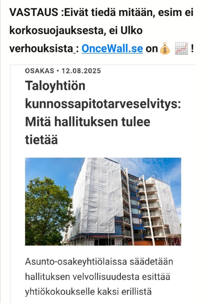 Tätäkään ei kerrota, Ruotsissa jo 60 vuotta 🏆🇸🇪 ja vastikkeet pienenee n 70 – 100 vuoden ajalta. Kt säästö on helposti yli 3.00.000 € :