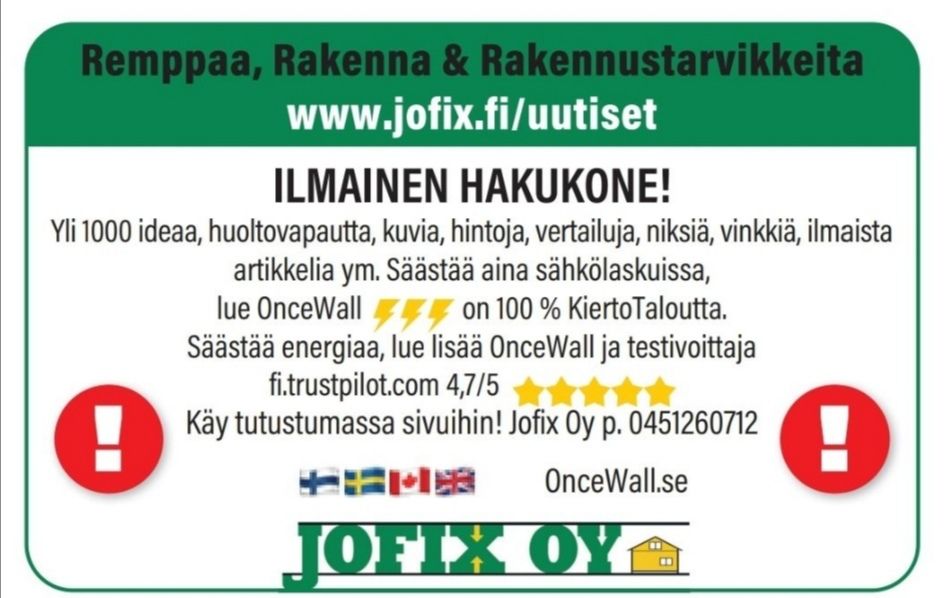 TEE ITSE – www teeitse.com on hyvä Neuvonta sivusto – MUTTA Testi /Arvostelu voittaja 2024 OnceWall.se Energia / Säästö paneeli puuttuu sieltä. OnceWall ei löydy myöskään Rautakaupoista eikä netistä – vain meiltä koko Suomeen www.jofix.fi / OnceWall, lue artikkeli niin tiedät :