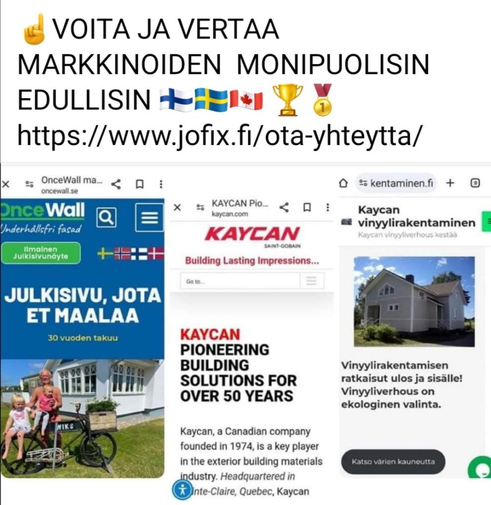Maailmalla paloturvalliset huoltovapaat, paksut n 2 mm pvc vinyyli Ulkoverhous paneelit ovat jo 1960 luvulta lähtien ollut pysyvästi 33-90 % halutuin materiaali.