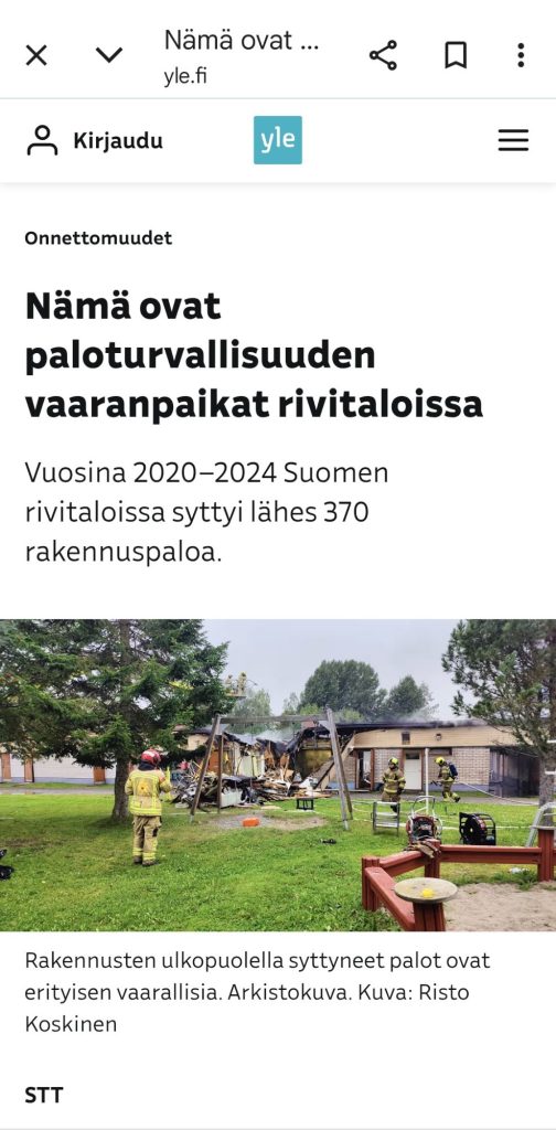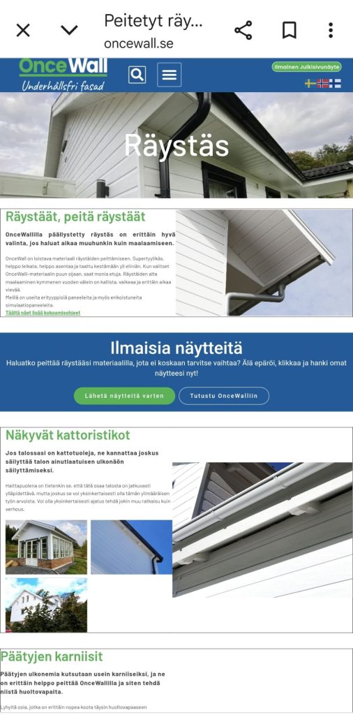 YLE / Uutiset RT RÄYSTÄÄT edistävät paloa. Mutta PALOTURVALLISET OnceWall eivät syty (syy mm NaCl 60%) ikuisesti suojatut räystäät – eikä koskaan maalata ( pahinta ja vaarallisinta maalausta, vammautuneita) . Räystäiden peittämisen vaihtoehtoja siistiksi. https://oncewall.se/takfot/YLE ARTIKKELI :https://yle.fi/a/74-20165175